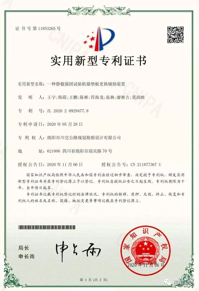 近日,从国家知识产权局获悉,公司研发的“一种施工工地管理系统”和“一种静载锚固试验机锚垫板更换辅助装置”喜获国家实用新型专利。